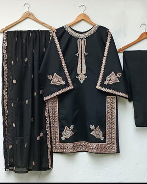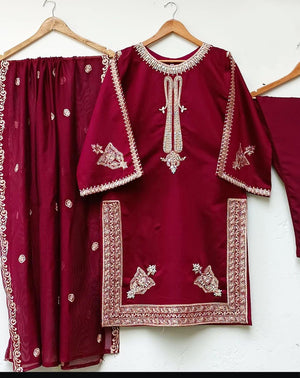 Front Neck, Sleeves And Daman Embroidery Shirt with Embroidered Dupatta 3Piece