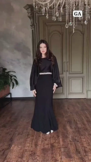 Crafted from premium silk fabric, this stunning black maxi features crystal hand embellishment on the waist and sleeves, enhancing its graceful silhouette.